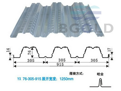 YX76-305-915鍍鋅樓承板,也叫壓型鋼板、鋼承板、鋼樓承板,是76mm波高3W樓承板最常用板型。其波高76mm,波寬305mm,有效寬度為915mm。其采用1250mm熱鍍鋅鋼板為基材,經機器輥壓成型。主要用做樓層板,具有強勁的砼握裹力,更優越的結構斷面性質和耐火性能,使用階段:可代替底部受拉鋼筋,施工階段:可代替模板。廣泛應用于工業與民用建筑的樓面,大型公共建筑的高層樓面結構等,具有造價低、節約鋼筋、強度高、更長使用年限等特點.