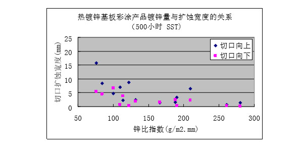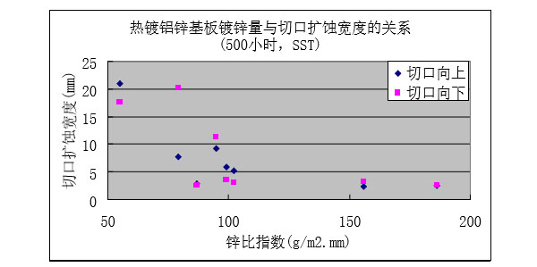 ?保留切口樣板的鹽霧試驗(1500小時)后,隨著鍍鋁鋅層重量增加,紅銹出現的比例降低。