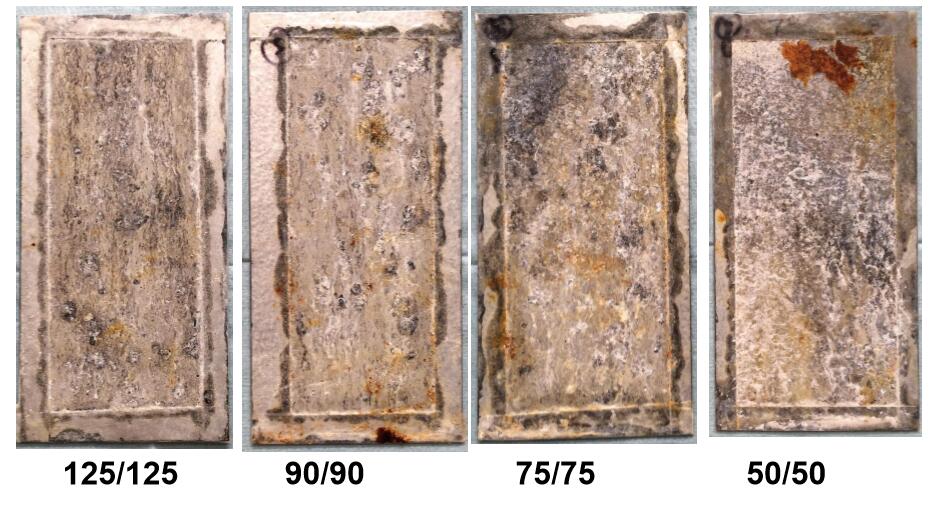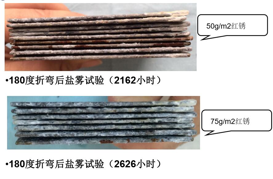 ?封邊鹽霧試驗(2162小時)后,相比50/50g/m2的鍍層產品,厚鍍層產品紅銹面積仍然很低