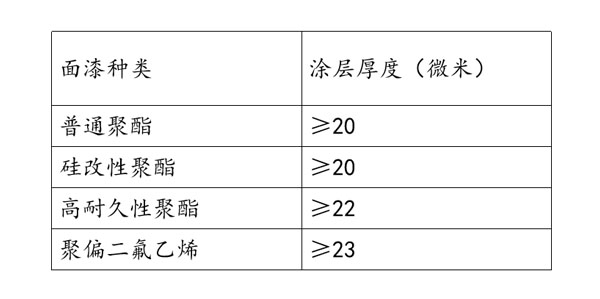 ?、叟浜夏途眯愿叩耐繉樱瑢氫搶υ擃惒释夸摪宓淖畹湾儗又亓恳策M行了限制,例如氟碳產品熱鍍鋅鍍層重量不小于110g/m2,鍍鋁鋅鍍層量不小于75/75g/m2