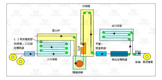 生產加工鍍鋅鋼卷可以分為三大步:首先將整卷帶鋼進行酸洗除銹、除污,讓鍍鋅鋼帶表面達到光亮干凈的效果;酸洗后,通過氯化銨或氯化鋅水溶液或者氯化銨和氯化鋅混合水溶液中進行清洗,然后送入熱浸鍍槽內,進行鍍鋅工藝;待鍍鋅工藝完成后即可入庫包裝。